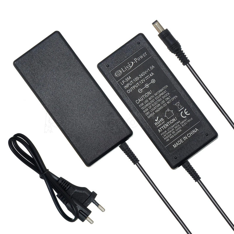 Блок питания Live-Power LP354 12V/4A=3,3A штекер 5,5х2,5 источник питания имеет защитный пластиковый корпус, который защищает от попадания пыли внутрь и дает возможность установки в пыльных и загрязненных местах. В комплекте с блоком идет кабель подключения к сети 220 В. Источник питания обладает высокой стабильностью выходного напряжения, имеет защиту от короткого замыкания и защиту от перегрузки. Технические характеристики: Сетевое зарядное устройство LP-354 Пластиковый корпус Тип блока питания: импульсный Диаметр штекера внешний 5,5 мм внутренний 2,5 мм Входное напряжение: 100-240В, 50/60 Гц Выходное напряжение: 12В Выходной ток: 4A=3,3A Типы защиты: защита от короткого замыкания, защита от перегрузки