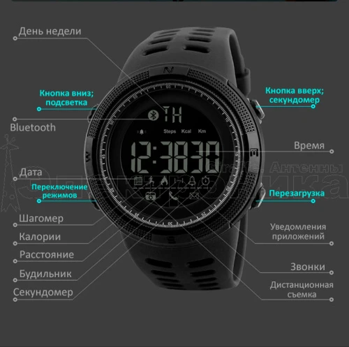 Функции: напоминание вызова, напоминание SMS, дистанционное управление камерой, приложение для мониторинга сна/калорий/расстояния/