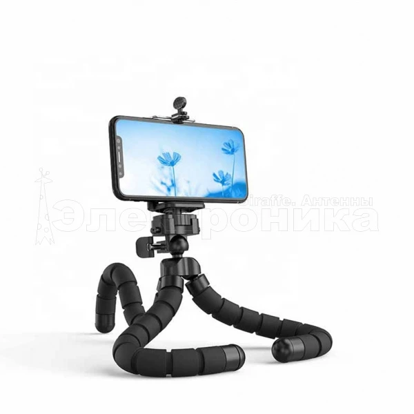 Трипод для смартфонов, фотоаппаратов и т.п Ножки гнущиеся изготовлены из губки, длина 20см Регулировка угла наклона на 180 градусов В комплекте крепление с выдвижным механизмом для смартфонов диагональю 4-6" Пульт для управления камерой смартфона по Bluetooth Совместим с Android и iOS Питание: 1 х CR2032 Цвет: черный Материал: пластик/силикон