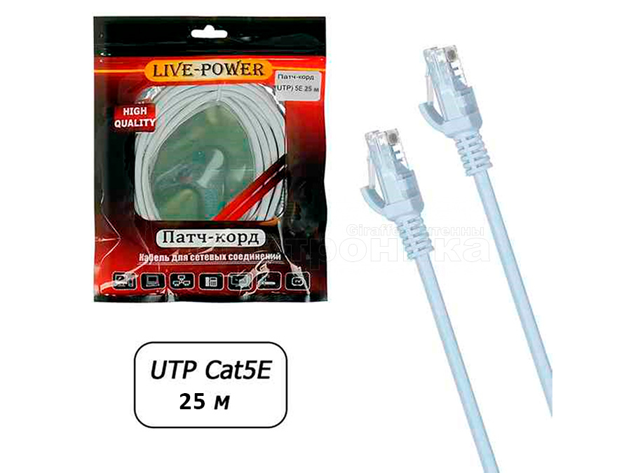 Патч-корд UTP 5e кат. литой 25 м предназначен для подключения активного и пассивного сетевого оборудования в составе структурированной кабельной системы, и представляет собой шнур из 4-х пар изолированных проводников, скрученных между собой, находящиеся в общей изоляции с разъемами типа 8P8C. Патч-корд (от англ. patching cord — соединительный шнур) необходим для соединения телекоммуникационного оборудования: компьютеры, офисные АТС, сетевые коммутаторы, концентраторы, коммутационные панели, маршрутизаторы, патч-панели в телекоммуникационных стойках, сетевые карты, а также другого оборудования, имеющего разъемы RJ-45. С обеих сторон шнура располагаются штекеры разъема RJ-45 (8P8C). Полоса пропускаемых частот от 100-125 МГц, что соответствует категории 5е.
