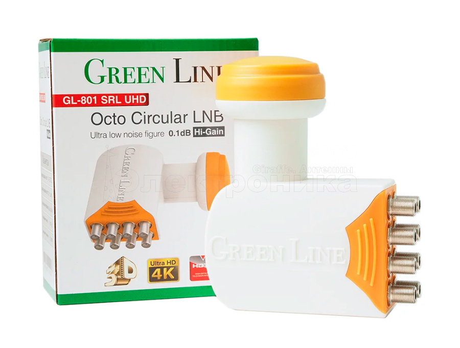 GL-801- это новый высококачественный спутниковый конвертер на 8 выходов для приема спутникового сигнала с круговой поляризацией. Этот конвертер подойдет тем, кто хочет смотреть до 8-ми телевизоров не используя при этом мультисвитч. Данное решение актуально когда все телевизоры находятся на относительно не большом расстоянии от антенны. Данный конвертер имеет самые высокие показатели на рынке на настоящий момент по уровню минимального шума, а также максимальное усиление до 65 дБ. Конвертер имеет низкое энергопотребление. При испытаниях в очень тяжелых условиях на антенне 55 см и длине кабеля 100 метров, показатели всех параметров сигнала были лучшими среди всех других конвертеров, которые были найдены и проверены. Данный конвертер с круговой поляризацией отлично подходит для приема сигналов Триколор ТВ и НТВ+.