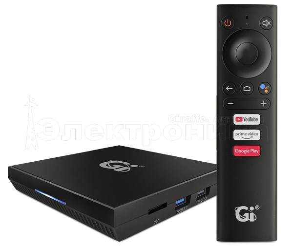 Приставка GI Premier работает на официальной операционной системе Android TV 10 и поэтому в базовой комплектации поставляется с Bluetooth пультом дистанционного управления со встроенным микрофоном и уже из коробки вы получаете рабочий Google Assistant.