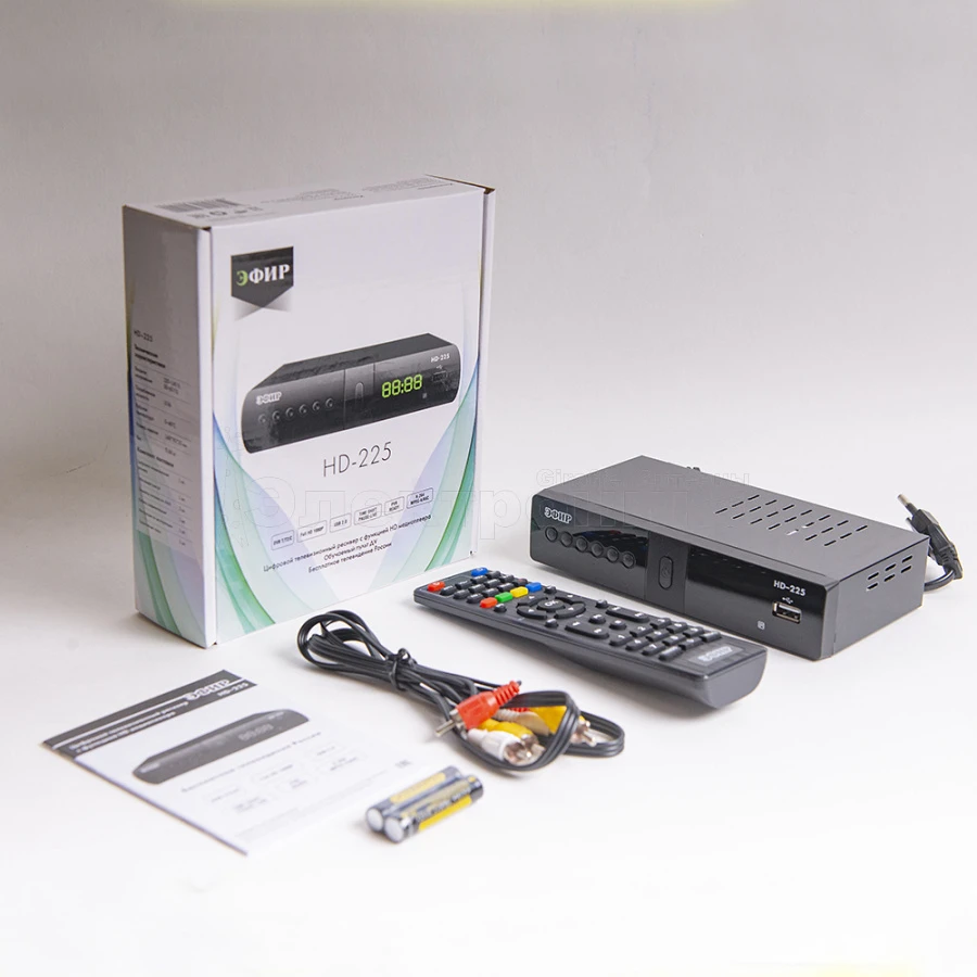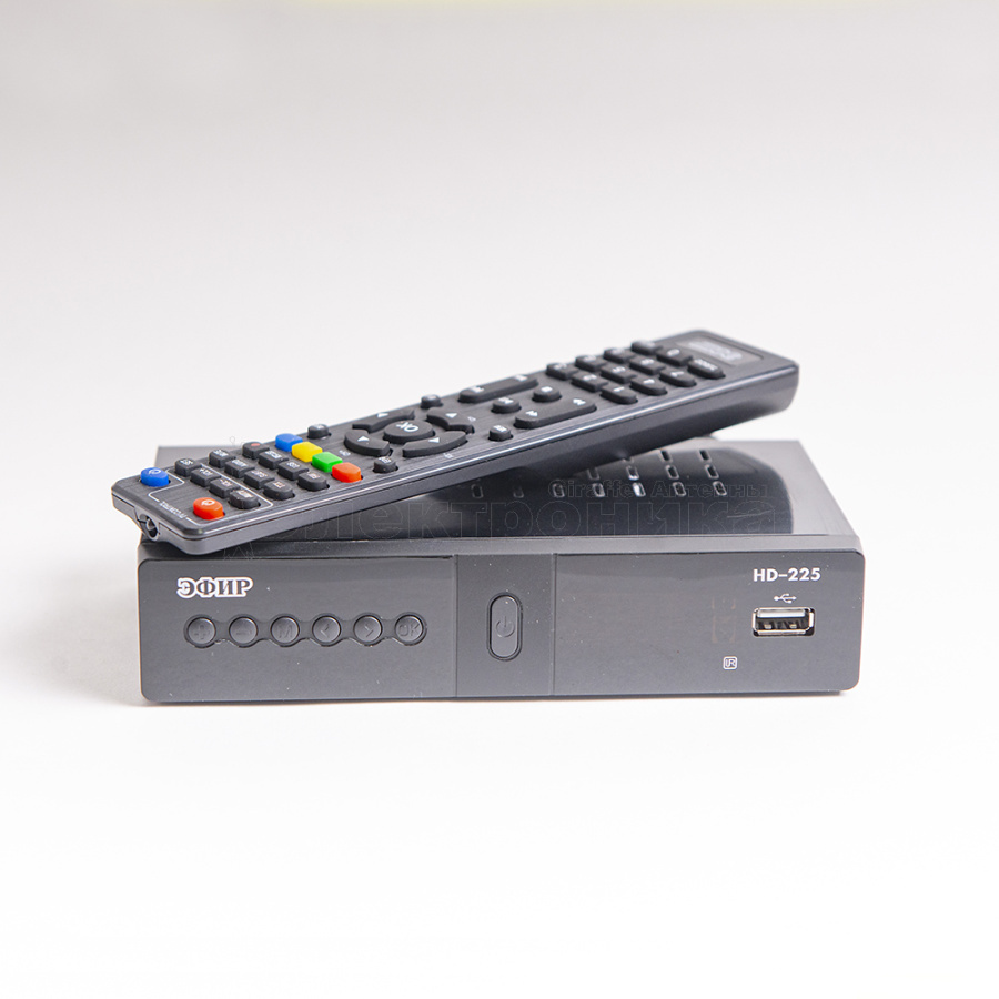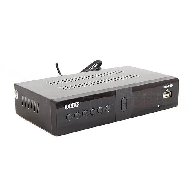 Эфир HD-225 с обучаемым пультом управления (можно с одного пульта управлять и ресивером, и телевизором), ресивер с функцией HD-медиаплеера для приема эфирного цифрового телевидения в формате DVB T/T2 и также кабельного DVB-C телевидения. Преимущество данного ресивера заключается в том, что он оснащен новым, современным, мощный и производительным чипсетом GX3235S с поддержкой Dolby Digital